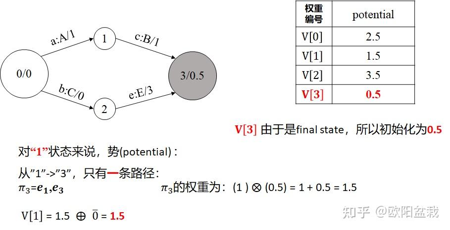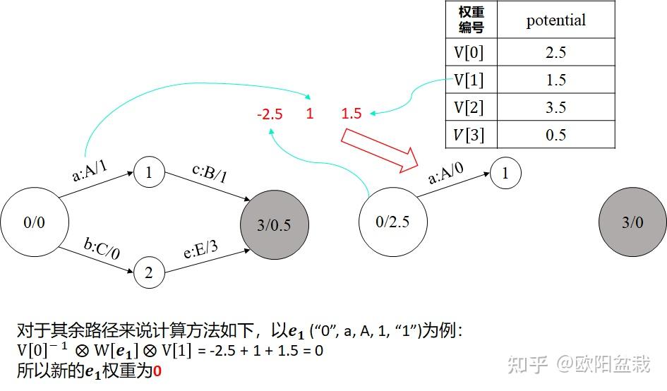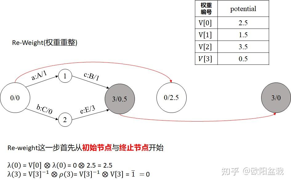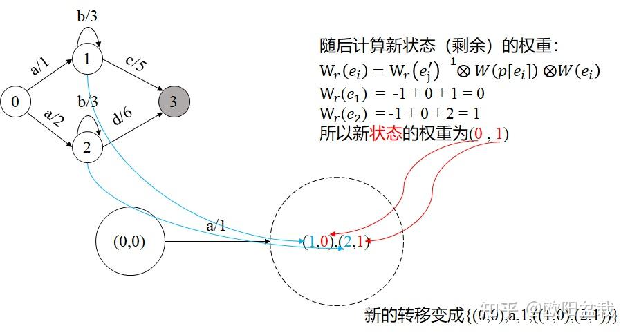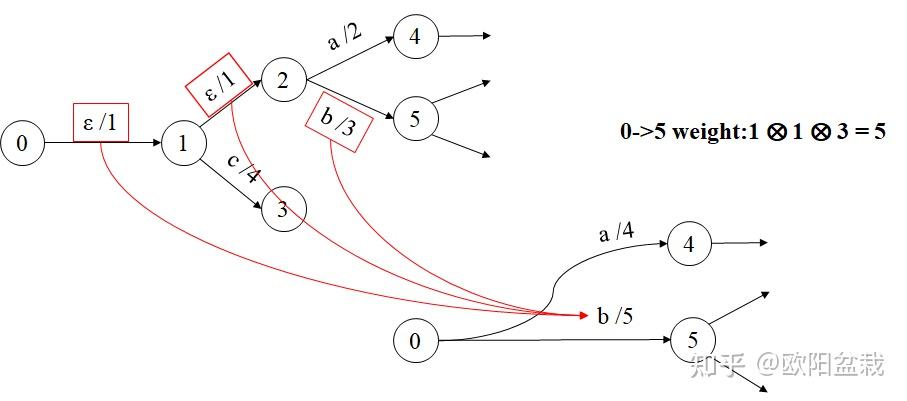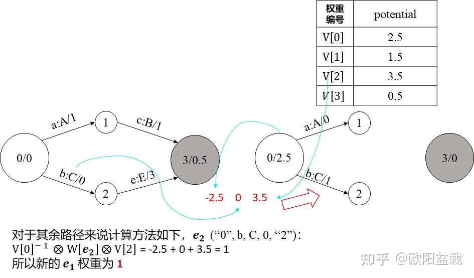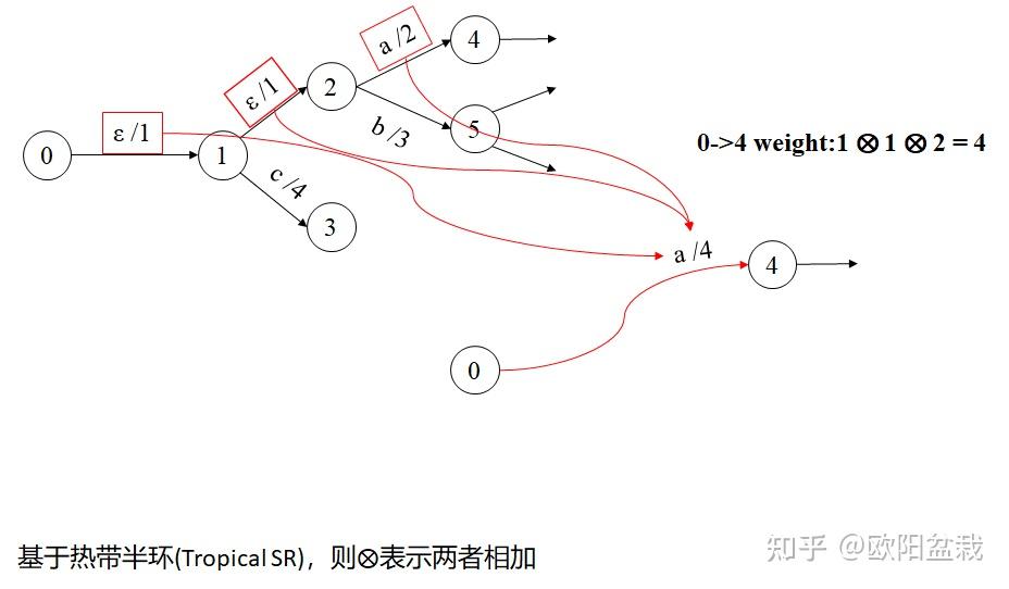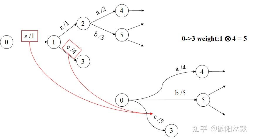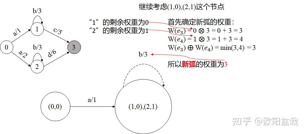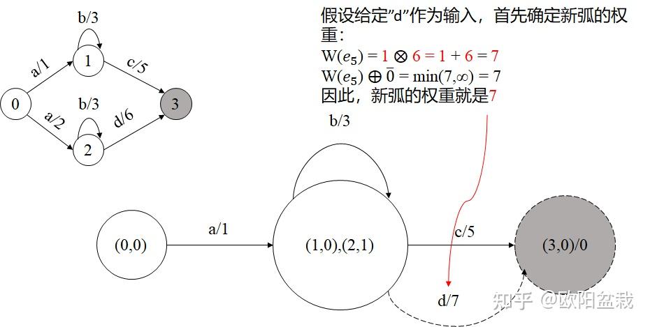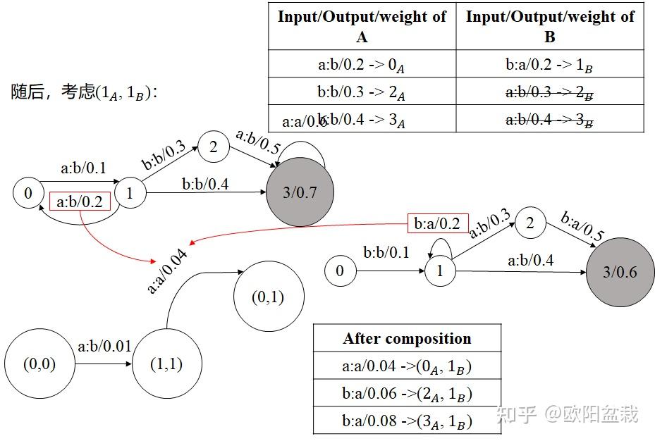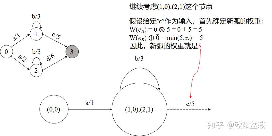 可以动手算一下:c为AC复合得到的,注意但是原文中的这个权重计算不太对,应该是相乘。而博客的示例可能是为了说明另一种权重系统(比如Tropical半环,其中权重为负对数概率,则组合时权重相加)而设计的。但是他没有转成负对数,有点奇怪。