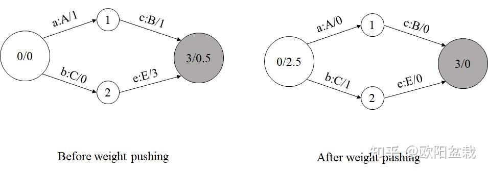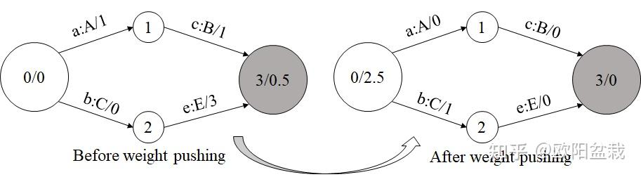 Weight Pushing运算的作用是把一个WFST所有路径的weight分布往初始状态push,但是不改变任何成功路径的weight。