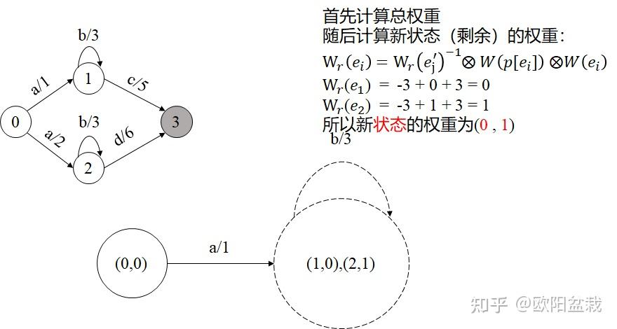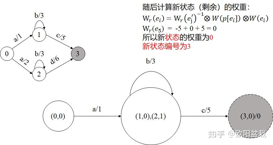 ⨁操作决定的(例如在 Tropical Semiring 下是min(1, 2) = 1,在 Probability Semiring 下是1 + 2 = 3)。”• “剩余权重(Remaining Weight)”/“残差(Residual)”的概念引入: 在确定化过程中需要记录额外信息以处理非确定性的权重分布。它触及了标准 WFSA 确定化算法(如 Mohri 提出的权重推送算法)的核心思想——跟踪每个状态在合并子集内的权重偏差,以便正确地组合后续路径权重。