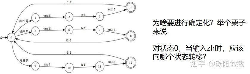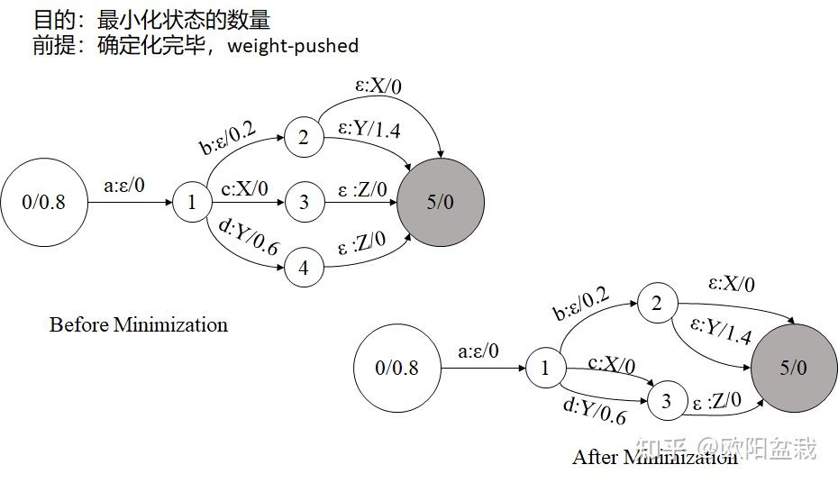 max) 的对应操作变成了取最小值 (min) (Tropical半环的⨁)。 因为较小的负对数权重对应较大的原始概率。WFSA/WFST 确定化 (Determinization) 的核心挑战: