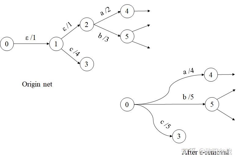 WFST构建过程中,ε的状态转移对整体输入输出序列没有贡献,存在一个算法(ε-消除算法)把一个ε-NFA转换成与之等价的没有ε-跳转的NFA。